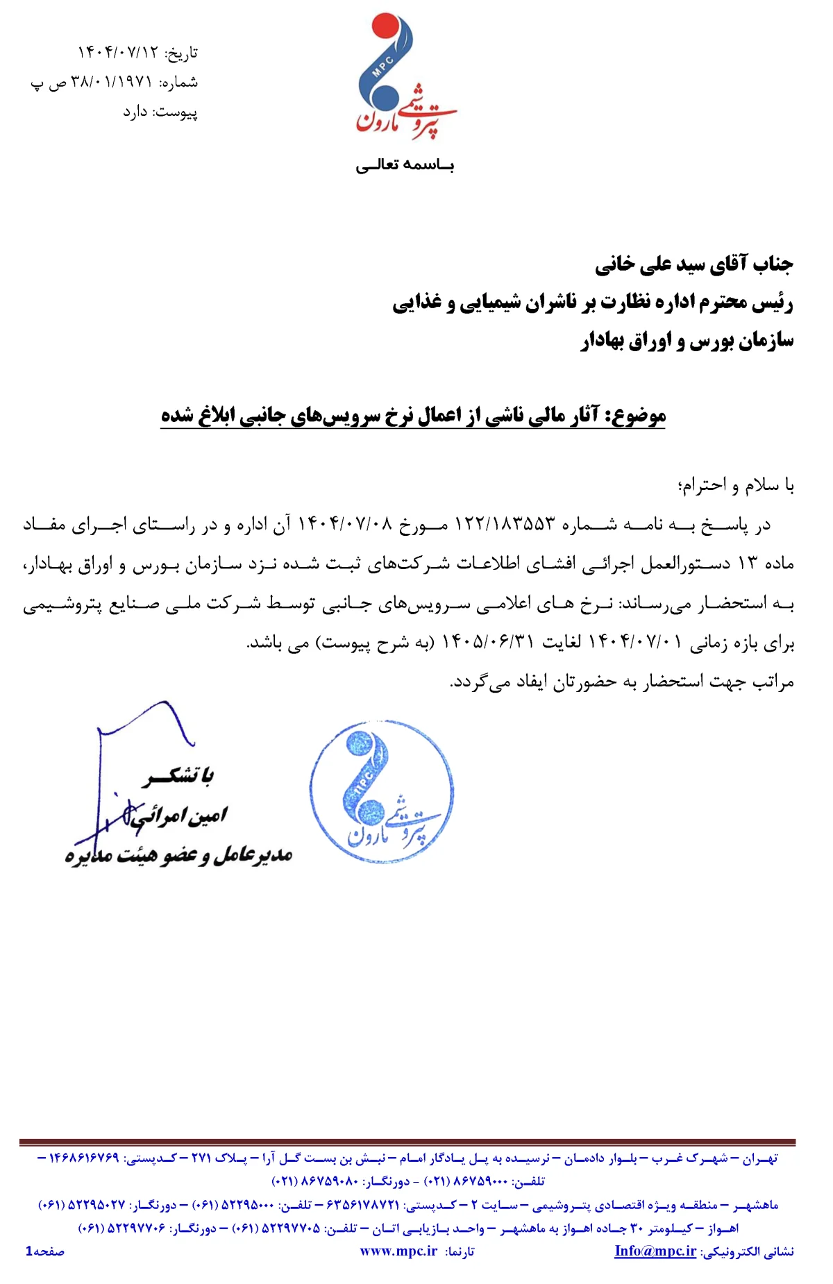 این شرکت طی نامهای رسمی به تاریخ ۱۲ مهر ۱۴۰۴ به اداره نظارت بر ناشران شیمیایی و غذایی سازمان بورس و اوراق بهادار، آثار مالی نرخهای جدید سرویسهای جانبی ابلاغی را اعلام کرد.